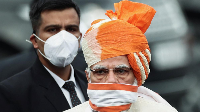 Thủ tướng quấn một chiếc khăn xếp turban màu cam, trắng trên đầu, và che mũi và miệng bằng miếng vải cùng màu. Chương trình Ngày Độc lập năm nay được tổ chức tại Pháo đài Đỏ từ thế kỷ 17 với quy mô thu nhỏ do đại dịch Covid-19.